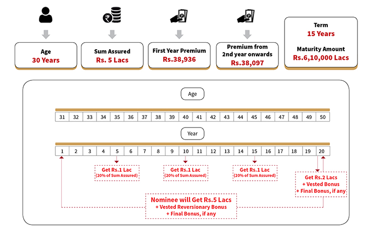 • This plan offers guaranteed tax-free 20% of Sum Assured in 5th, 10th & 15th Year of the policy. The premium payment term in this plan is 15 years.